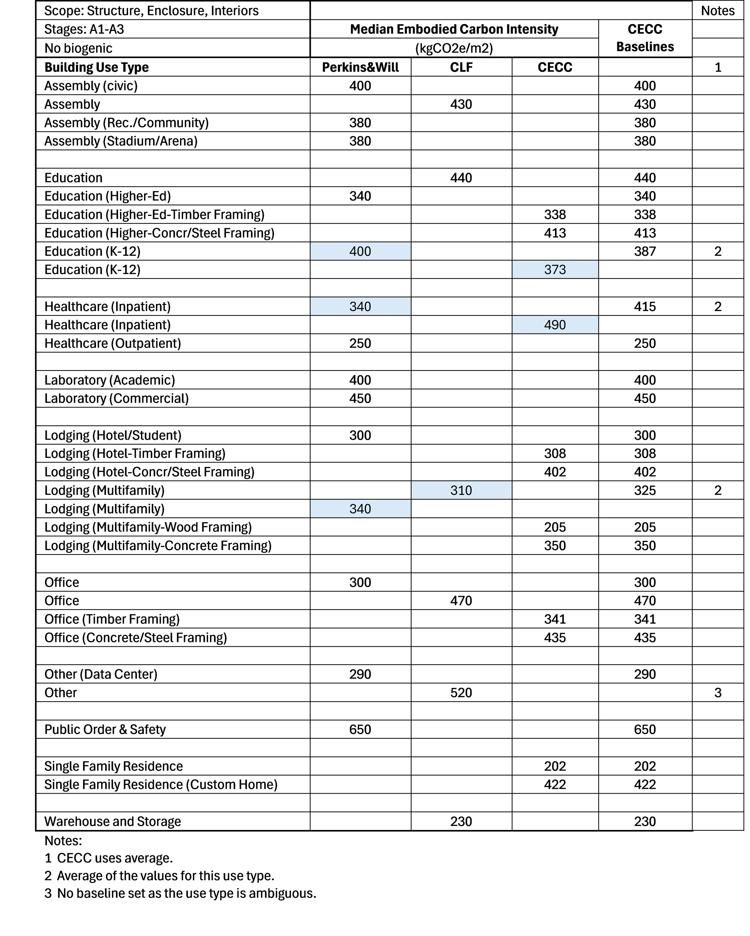 The following chart shows the embodied carbon intensities for the building use types from all three sources, and the resultant CECC Building Baselines.