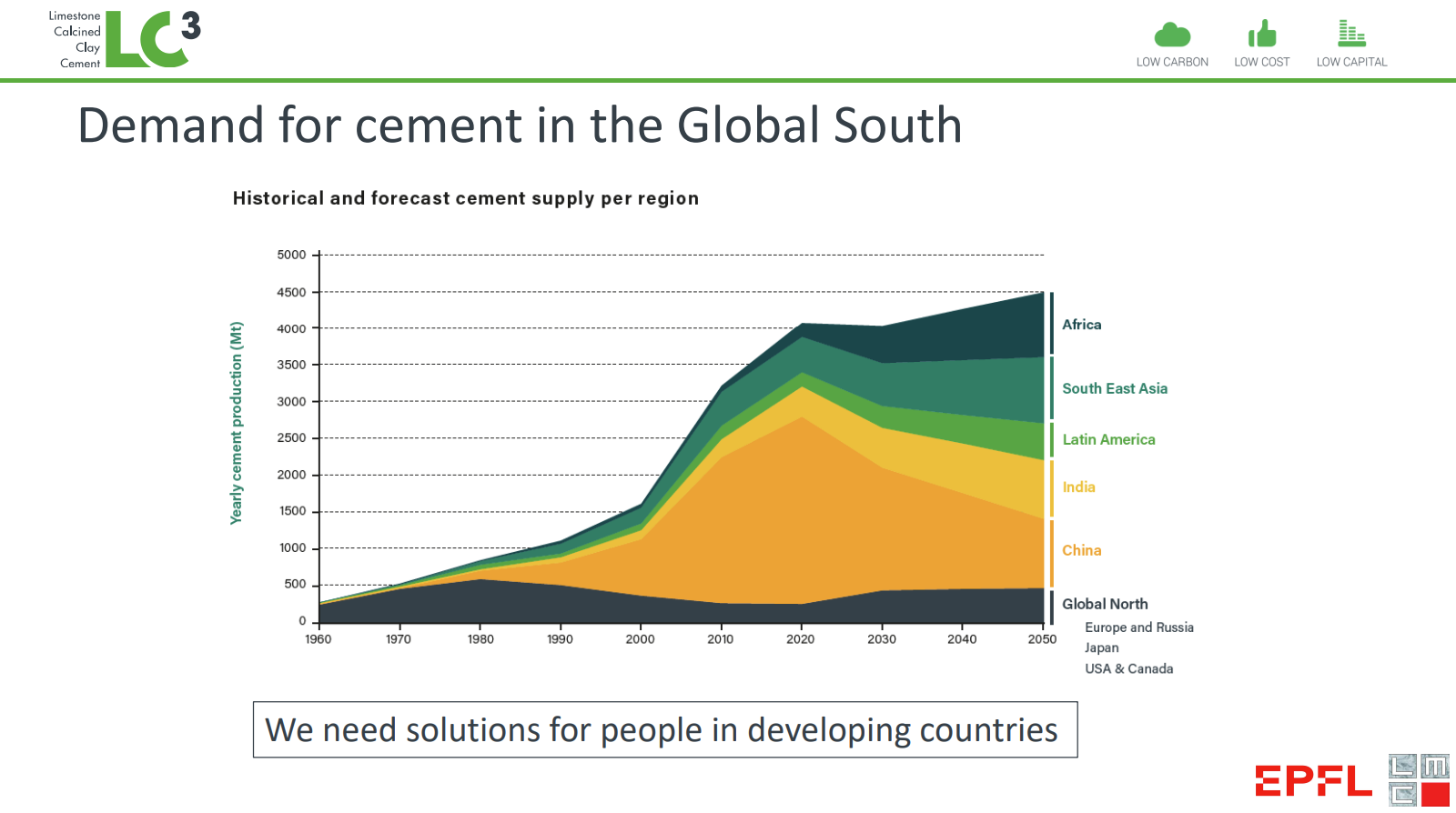 The Swiss institute that developed LC3 is the Ecole Polytechnique Federale de Lausanne (EPFL). This institute is also supported by the Swiss Agency of Development and Cooperation (SDC) whose mission is to “alleviate suffering and poverty worldwide, promote peace and security, and to protect the environment”. LC3 cement is currently being produced in Colombia, India, Ghana, Malawi, France, and Denmark. The rapid development of LC3 in the global south is due to the efforts and support by the SDC. Over 90% of global cement production is concentrated in the Global South with the largest expected growth in Asia and Africa.