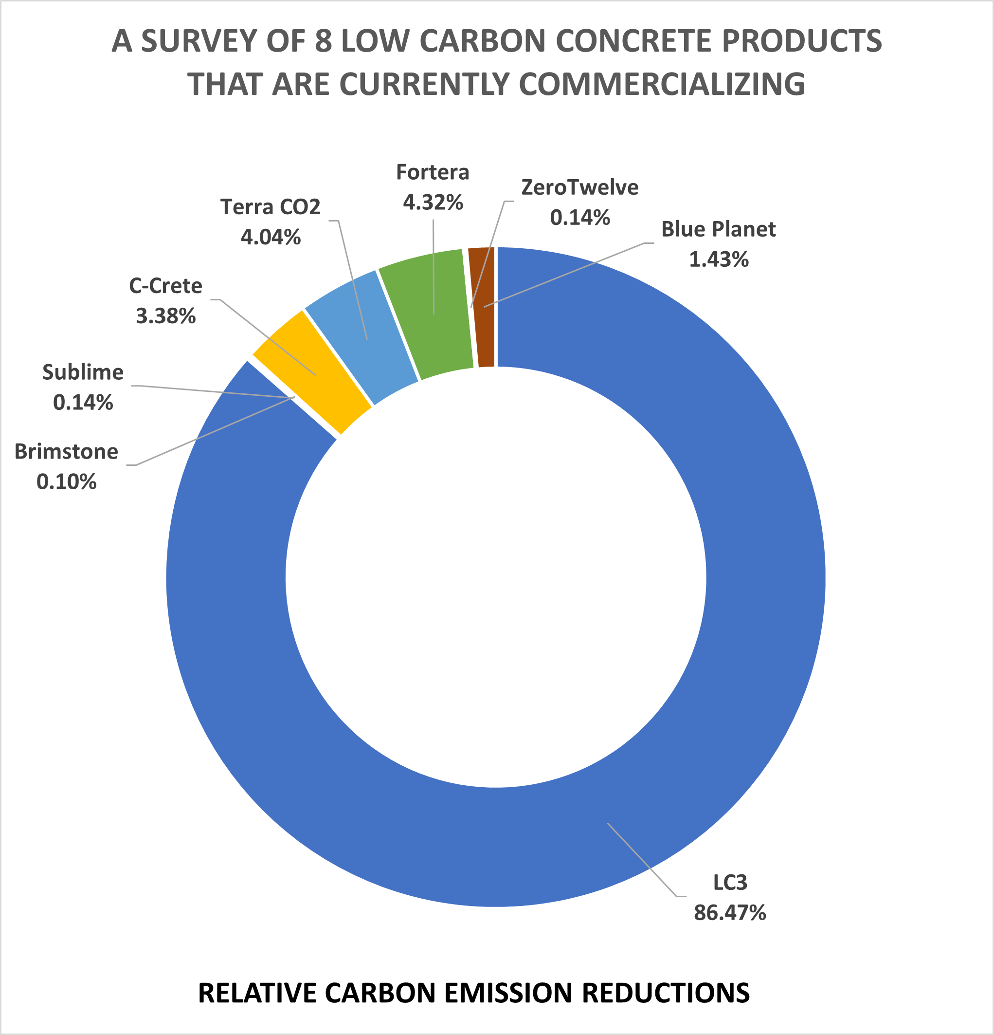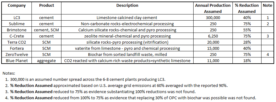 The stated carbon emission reductions of the 8 products were evaluated and certain adjustments made to align the assumptions with the current set of conditions in attempts to create a level playing field. An example adjustment made is for Sublime Cement.